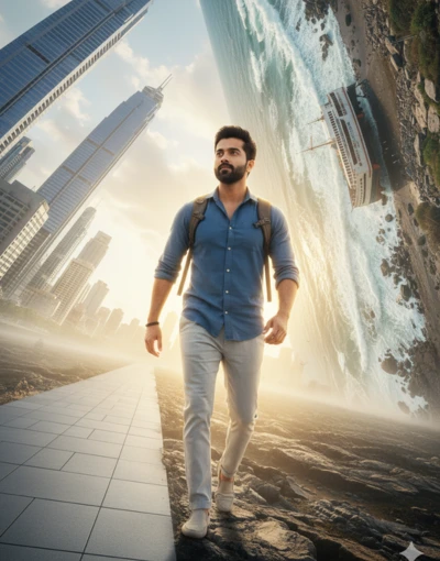 A hyper-realistic, wide-angle, slightly low-angle shot with cinematic and volumetric golden hour lighting, depicting a surreal and impossible landscape. The main subject, a person with an uploaded face as reference, is captured in a dynamic walking stride, with their left leg forward and right leg back, arms swinging naturally. They are wearing a blue long-sleeved button-up shirt with sleeves rolled up to the forearms, light grey linen pants, and light beige slip-on shoes, carrying a dark backpack with light straps, and a dark wristband on their right wrist. The character’s head is tilted slightly upwards, looking towards the upper right, conveying a sense of determination and wonder. The composition features a strong diagonal line created by the steeply inclined path the character is walking on. This path transitions from a modern, grey tiled or paved surface on the left to a rugged, rocky, natural terrain on the right, directly beneath the character’s feet. In the background, two distinct, highly detailed, and dramatically tilted realities converge: on the upper left, a modern cityscape with towering skyscrapers and angular buildings appears to defy gravity, leaning sharply upwards and to the left under a bright, slightly overexposed sky with soft clouds. On the upper right, a turbulent, rocky coastline with a large, partially submerged or beached ship (resembling a cruise liner or ferry) in foamy, crashing waves is similarly tilted upwards and to the right. The lighting creates a strong rim light effect on the character, separating them from the bright, ethereal background, with subtle lens flares and atmospheric haze. The textures of the clothing, rocks, water, and building facades are incredibly detailed, emphasizing the hyper-realistic quality of the image.