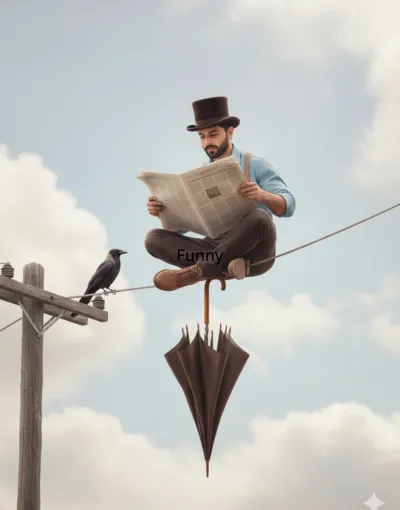 A hyper-realistic, 8K, surreal low-angle wide shot presents a whimsical, dreamlike moment, brought to life with cinematic lighting and finely detailed textures. A person—using an uploaded face as reference—is casually seated high atop a thin utility wire, seemingly defying gravity, set against a soft, diffused sky filled with clouds and hints of blue. The individual is dressed in a dark brown top hat, a light blue long-sleeved shirt, light brown suspenders, dark brown trousers, and light brown lace-up boots. Fully absorbed, they are reading an open, folded newspaper in a light beige tone, featuring visible column grid lines. Immediately to their left, a dark-feathered crow rests calmly on the same wire, gazing toward the right. Directly beneath the person, a closed dark brown umbrella hangs from the wire by its curved handle. The utility wire stretches diagonally from a weathered wooden utility pole positioned at the far left of the frame, grounding the composition with a strong visual line. Soft, slightly overcast daylight bathes the scene, casting gentle shadows and accentuating the rich textures of the clothing, the crow’s feathers, the aged wood, and the paper. The overall mood remains serene, painterly, and quietly magical.
