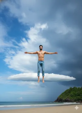 A hyper-realistic, 8k, cinematic medium shot captured with a 35mm lens from a low-angle perspective, depicting a young man impossibly floating in a vast, dynamic sky. The man is shirtless and wears light blue denim jeans rolled up at the ankles, with arms outstretched horizontally and legs bent at the knees as if suspended in mid-air. The uploaded face as reference. This surreal scene places the man directly above a distinct, long, thin horizontal white cumulus cloud, which appears to be a solid platform in the sky. Below this cloud, the horizon line reveals a sandy beach in the foreground, meeting a calm ocean, with a lush green, rocky headland visible on the far right. The sky above transitions from a brilliant azure blue with scattered wispy clouds on the left to a darker, more dramatic stormy blue-grey with heavier, textured clouds on the right. Bright, natural daylight provides soft, cinematic lighting, illuminating the man and the clouds with subtle volumetric depth and highly detailed textures on the denim, skin, and cloud formations, emphasizing the dramatic contrast between the clear and stormy sky sections. The composition highlights the man’s central, elevated position against the expansive sky, conveying a profound sense of freedom and wonder.