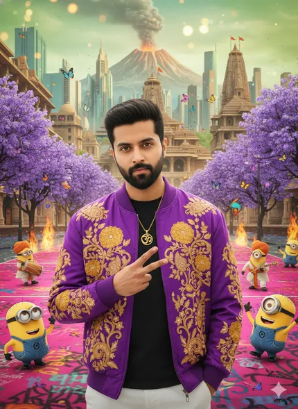 A cool young Indian guy in a purple bomber jacket embroidered with marigold flowers and paisley patterns flashes a peace sign. He wears a matching a gold chain with a Om pendant. Behind him, a surreal cityscape blends modern Indian high-rises with a smoking volcano in the distance — reminiscent of the mythical Mount Kailash. Purple jacaranda trees line the streets, and cartoon Minions dressed in dhotis and turbans dance around him. Flames and butterflies float in the air, and the ground is a bright pink basketball court with Hindi graffiti. The vibe is hyper-stylized, pop-art meets Bollywood street style, with a touch of mythological fantasy. 8K photo-realistic DSLR lens blur ,soft natural light ,creamy bokeh ,a surreal, humorous, hyper-realistic with these attached images (100.999% same facial features)