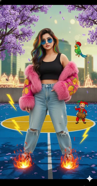 A trendy Indian girl with long wavy hair and rainbow streaks stands confidently on a vibrant blue rooftop basketball court lined with purple jacaranda trees. She wears oversized blue-tinted glasses, a black crop top, high-waisted jeans, and a bold pink bomber jacket with fur trim and embroidered mango motifs. Floating around her are animated elements: a parrot wearing a tiny turban, a cartoon jester playing dholak, fire bursts, and yellow lightning bolts. In the background, glass skyscrapers reflect the sky, and a stylized Indian city skyline glows behind. The art style is comic-book meets urban desi fashion — bold, energetic, and dripping with Indian street culture flair. 8K photo-realistic DSLR lens blur ,soft natural light ,creamy bokeh ,a surreal, humorous, hyper-realistic with these attached images (100.999% same facial features) The foreground create deep DSLR style bokeh. The background is dissolve into smooth green and yellow blur with subtle warm highlights.