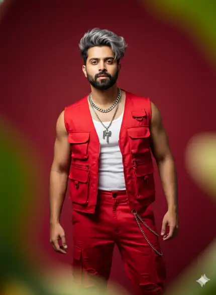 A young Indian man with stylishly tousled silver-gray hair stands confidently against a vibrant red studio background. He wears a bold red sleeveless utility vest over a fitted white tank top, paired with matching red cargo pants featuring distressed rips at the knees and silver chains hanging from the pockets. Heavy silver chain necklaces adorn his neck, one with a pendant. His expression is cool and intense, gazing directly at the camera. The lighting is dramatic and high-contrast, highlighting his toned physique and the glossy texture of his outfit. The overall aesthetic is edgy, urban, and fashion-forward — reminiscent of K-pop or streetwear editorial photography.. 8K photo-realistic DSLR lens blur ,soft natural light ,creamy bokeh ,a surreal, humorous, hyper-realistic with these attached images (100.999% same facial features)
