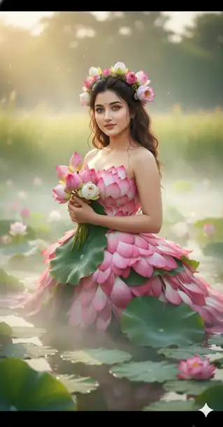An elegant Indian woman emerges from a misty lotus pond, her skin glistening with dew. She is adorned in a breathtaking haute couture gown crafted from real pink and white lotus petals and large green leaves, styled into a flowing, strapless dress that hugs her form. A crown of fresh lotus buds and leaves rests on her wet, dark hair. She holds a cluster of blooming lotus flowers against her chest, surrounded by floating water lilies and soft morning fog. The lighting is soft and diffused, creating a serene, divine atmosphere — as if she is a nature goddess born from the sacred waters. The mood is tranquil, poetic, and deeply rooted in South Asian natural symbolism..8K photo-realistic DSLR lens blur ,soft natural light ,creamy bokeh ,a surreal, humorous, hyper-realistic with these attached images (100.999% same facial features) The foreground create deep DSLR style bokeh. The background is dissolve into smooth green and yellow blur with subtle warm highlights.