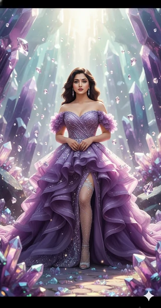 A stunning Indian woman stands gracefully amidst a towering landscape of glowing amethyst and lavender crystal formations under a bright, ethereal sky. She wears an opulent off-the-shoulder gown made entirely of cascading ruffled fabric in shades of violet and lilac, with a high slit revealing one leg. Her long, wavy hair flows over her shoulders, and she gazes confidently at the viewer. Shards of translucent crystals float around her like magical snowflakes, catching the soft sunlight. The scene is cinematic, dreamlike, and luxurious — blending fantasy, fashion, and natural wonder with a cool-toned, iridescent color palette. 8K photo-realistic DSLR lens blur ,soft natural light ,creamy bokeh ,a surreal, humorous, hyper-realistic with these attached images (100.999% same facial features) The foreground create deep DSLR style bokeh. The background is dissolve into smooth green and yellow blur with subtle warm highlights.