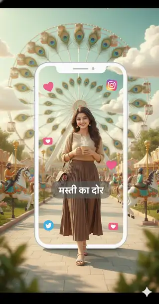 A young Indian woman in stylish casual wear — a beige kurta top with rolled sleeves and a brown pleated skirt — walks confidently through a whimsical, pastel-colored Indian amusement park. She holds a cup of masala chai in one hand and carries a floral crossbody bag. Behind her, a giant white smartphone frame displays her photo, adorned with floating pink hearts, emoji stickers, and social media icons. In the background, a giant Ferris wheel shaped like a peacock feather spins against a sky filled with cotton candy clouds. Colorful carousel horses painted with Rajasthani motifs spin nearby. The entire scene is bathed in soft, dreamy lighting with a playful, Instagrammable aesthetic. Text on the phone frame reads “मस्ती का दौर” (Masti ka Daur – Tour of Fun) in Hindi script. 8K photo-realistic DSLR lens blur ,soft natural light ,creamy bokeh ,a surreal, humorous, hyper-realistic with these attached images (100.999% same facial features)