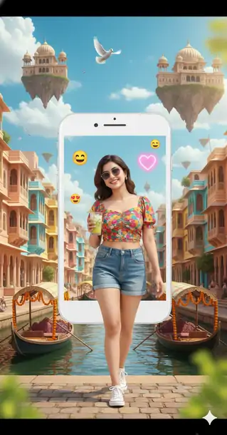 A cheerful Indian girl wearing sunglasses, a floral crop top, denim shorts, and white sneakers strolls along the edge of a canal in a magical version of Varanasi or Udaipur. She holds a glass of nimbu pani (lemonade) with a straw. Behind her, a giant white smartphone frame captures her pose, surrounded by floating emojis and pink hearts. Instead of Venetian buildings, colorful havelis with jharokhas line the water, and floating palaces with onion domes inspired by Mughal architecture drift above. A white pigeon flies overhead. Gondolas are replaced with ornate wooden shikaras decorated with marigolds. The sky is bright blue with fluffy clouds, and the mood is joyful, surreal, and distinctly Indian. 8K photo-realistic DSLR lens blur ,soft natural light ,creamy bokeh ,a surreal, humorous, hyper-realistic with these attached images (100.999% same facial features)