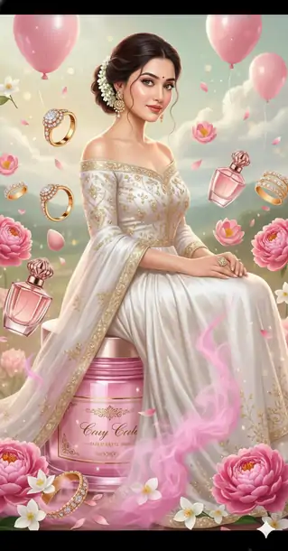 A graceful Indian woman in an off-shoulder white silk gown sits elegantly atop a giant pink cosmetic jar, surrounded by swirling pink smoke and floating beauty products. Around her float gold rings with Kundan stones, rose-gold perfume bottles, makeup sponges shaped like lotus petals, and delicate bangles. Pink peonies and jasmine flowers bloom in the air. Her hair is styled in a loose bun with a gajra (flower garland), and she wears subtle bindi and kohl-lined eyes. The background is ethereal and soft, with floating pink balloons and misty clouds. The overall aesthetic is luxurious, feminine, and deeply rooted in Indian bridal and beauty traditions — think Bollywood glamour meets high-end skincare fantasy. 8K photo-realistic DSLR lens blur ,soft natural light ,creamy bokeh ,a surreal, humorous, hyper-realistic with these attached images (100.999% same facial features) The foreground create deep DSLR style bokeh. The background is dissolve into smooth green and yellow blur with subtle warm highlights.