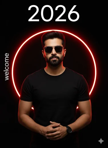 A cool, confident young man with a well-defined beard and dark sunglasses, wearing a simple fitted black t-shirt, standing perfectly centered against a pure, deep black background. His hands are calmly clasped in front of him, posture relaxed yet powerful. Behind him, a single flawless circle of intense red neon light glows vividly, forming a perfect halo that frames his upper body and creates striking contrast against the darkness. Above his head, the year “2026” appears in a clean, modern white sans-serif font, sharp and minimal. To the left side of the frame, the word “welcome” is written vertically in a thin white font, adding balance and graphic elegance. The image is captured in ultra-crisp 8K cinematic DSLR quality, with extreme clarity, high contrast, and precise edge definition. Lighting is highly controlled and directional, illuminating only the subject and the neon ring, producing dramatic shadows and a sleek, futuristic atmosphere. Subtle skin texture, realistic fabric detail, natural beard definition, and authentic light reflections enhance realism while maintaining a minimalist aesthetic. Facial identity consistency: 100.999% identical facial features, bone structure, skin texture, beard shape, hairline, and expression, perfectly matching the provided reference image, no deviation. Style: Ultra-realistic, cinematic, retro-modern, stylish, trendy, minimalist, edgy, graphic design Mood: Confident, festive, premium New Year celebration, bold, futuristic