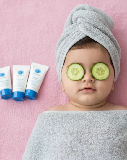 Two cucumber slices cover the baby’s eyes, surrounded by three white skincare lotion bottles
