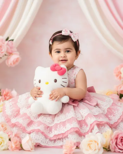 surrounded by pastel rose flowers and elegant draped curtains, wearing a layered pink and white lace dress with a satin bow and a