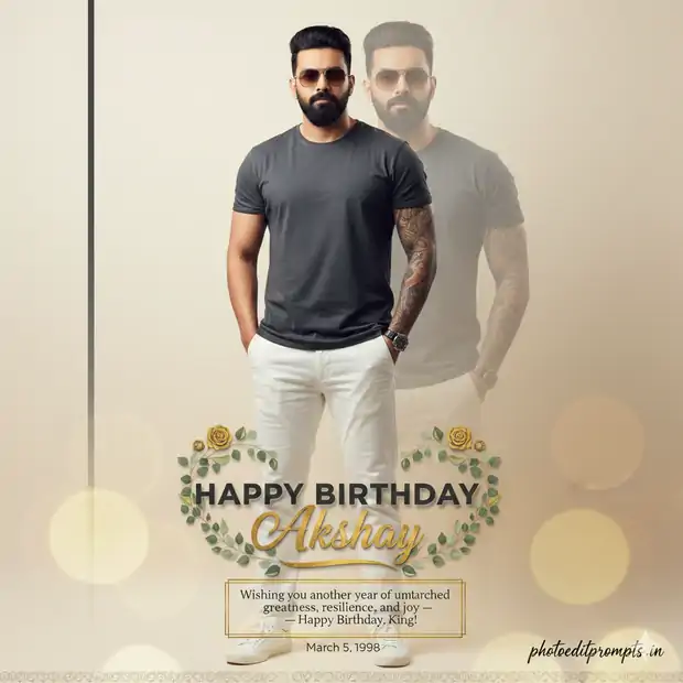 Ultra-detailed 8K photorealistic DSLR studio portrait with soft natural lighting, creamy bokeh, and shallow depth of field. Hyper-realistic rendering using the attached reference images with 100.999% identical facial features. The foreground features deep DSLR-style bokeh, while the background smoothly dissolves into green and yellow tones with subtle warm highlights. A cinematic full-body portrait of Indian man named “Akshay Patil”, standing confidently in sharp focus. He wears a dark charcoal-grey cotton t-shirt, crisp white chinos, and clean white sneakers. His left hand rests casually in his pocket while his right arm hangs relaxed. His signature beard is perfectly groomed, sunglasses catch the soft studio light, and his forearm tattoo shows realistic skin texture. Behind him, a semi-transparent, ghost-like duplicate of his upper torso floats subtly, creating an artistic layered effect. The background is a minimalist gradient transitioning from soft ivory to warm beige, accented by a thin vertical charcoal stripe on the left. At the bottom center, “HAPPY BIRTHDAY” appears in bold modern sans-serif uppercase with a subtle metallic sheen. Below it, “Akshay” is written in luxurious golden calligraphy, surrounded by curved rose vines and eucalyptus leaves with soft 3D box shadows for depth. Beneath this, an ornate golden frame encloses the message: “Wishing you another year of unmatched greatness, resilience, and joy — Happy Birthday, King!” The birth date “March 5, 1998” is placed discreetly in a small serif font. In the lower-right corner, the signature “photoeditprompts.in” appears in fine black calligraphy with gold-foil accents, resting above a delicate filigree border framing the poster.