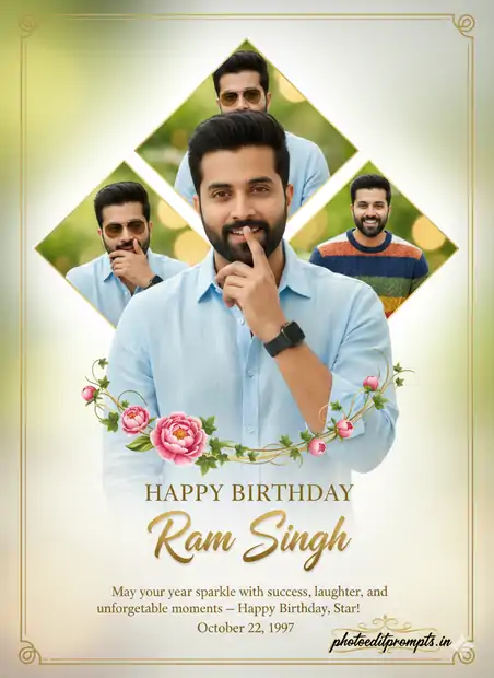 Ultra-realistic 8K DSLR portrait with soft natural light, creamy bokeh, and shallow depth of field. Hyper-detailed rendering using the attached images with 100.999% identical facial features. The foreground features rich DSLR-style bokeh, while the background blends into smooth green-yellow tones with warm highlights. A joyful, high-resolution portrait of Indian man “Ram Singh”, smiling gently with his right index finger playfully touching his lips. He wears a light sky-blue linen shirt with rolled sleeves and a sleek black smartwatch. Skin texture, fabric weave, and natural eye catchlights are rendered with extreme realism. Behind him, three floating diamond-shaped photo panels add depth: • Top panel: close-up portrait in aviator sunglasses • Bottom-left: laughing while covering his mouth • Bottom-right: smiling brightly in a textured sweater Each panel features subtle vignette and bokeh blur. The background is pure luminous white with a soft ambient glow. Centered below, “HAPPY BIRTHDAY” appears in refined uppercase serif lettering. Beneath it, “Ram Singh” is written in flowing golden calligraphy, adorned with swirling peony flowers and ivy tendrils, enhanced with inner glow and drop shadows for a 3D effect. A delicate engraved golden border surrounds the image, enclosing the message: “May your year sparkle with success, laughter, and unforgettable moments — Happy Birthday, Star!” The birth date “October 22, 1997” appears below the name in a classic small font. Bottom-right corner features the “photoeditprompts.in” signature in elegant black calligraphy with a gold outline, finished with a miniature decorative flourish.