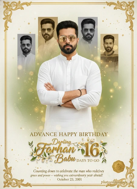 High-end 8K photorealistic DSLR portrait with soft natural lighting, creamy bokeh, and cinematic depth. Hyper-realistic facial accuracy using attached images with 100.999% identical facial features. The foreground contains deep DSLR bokeh, while the background fades into smooth green and yellow tones with warm highlights. A striking portrait of “Farhan”, standing confidently in a crisp white kurta with arms crossed, gazing directly at the viewer. Sunglasses reflect subtle studio lighting, and every fabric thread is sharply defined. Behind him, four vertical portrait panels display monochrome and sepia-toned variations of his expressions and outfits, softly blurred with atmospheric haze. The background is creamy off-white with faint watercolor textures and scattered gold dust for a luxurious feel. At the bottom, “ADVANCE HAPPY BIRTHDAY” appears in elegant serif uppercase. Below it, “Farhan” is rendered in bold golden calligraphy, accompanied by stylized text elements — “Darling” in cursive and “Ali” in structured block lettering — wrapped in jasmine vines and olive branches with a 3D shadow effect. The number “16” glows in brushed gold with embossed texture, followed by “DAYS TO GO” in minimal uppercase. A rich golden filigree border frames the poster, enclosing the message: “Counting down to celebrate the man who redefines grace and power — wishing you an extraordinary year ahead!” The birth date “October 23, 2001” is subtly placed near the lower edge. Bottom-right corner includes the “photoeditprompts.in” signature in luxurious cursive with gold-leaf detailing and a decorative seal motif.
