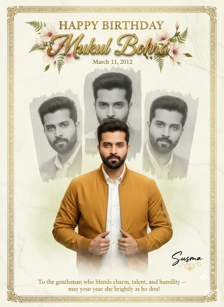 Ultra-sharp 8K DSLR studio portrait with soft natural light, creamy bokeh, and shallow depth of field. Hyper-realistic rendering using attached images with 100.999% identical facial features. Foreground depth features professional DSLR bokeh, while the background melts into green-yellow tones with gentle warm highlights. A refined studio portrait of “Mukul Bohra”, standing front-and-center in a mustard-yellow bomber jacket layered over a white shirt. He lightly grips the jacket lapels, exuding calm confidence. The jacket texture, fabric sheen, and subtle stubble are captured in lifelike clarity. Behind him, three overlapping black-and-white portrait panels show expressive facial angles, framed with soft brushstroke edges and gentle vignettes. The background is clean ivory with a subtle marble-grain texture. At the top, “HAPPY BIRTHDAY” appears in bold, slightly embossed serif lettering. Below, “Mukul Bohra” is written in opulent golden calligraphy, entwined with magnolia flowers and fern leaves, enhanced by layered 3D shadows. An intricately engraved golden border surrounds the composition, enclosing the message: “To the gentleman who blends charm, talent, and humility — may your year shine as brightly as you do!” The birth date “December 28, 2002” appears discreetly beneath the name. Bottom-right corner displays the “photoeditprompts.in” signature in graceful black calligraphy with gold-foil accents and a small ornamental flourish.
