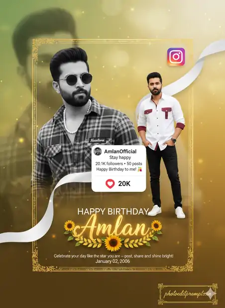 Hyper-realistic 8K DSLR birthday poster with soft lighting, creamy bokeh, and ultra-sharp details. Facial accuracy matches the attached reference images with 100.999% identical features. The foreground has professional DSLR blur, while the background transitions into smooth green-yellow tones with warm highlights. A photorealistic Instagram-themed birthday design. The background is vibrant golden-yellow, accented by a sweeping diagonal white ribbon for dynamic movement. On the left, a large monochrome portrait of a stylish young man with pompadour hair, round sunglasses, and a pearl necklace, wearing a plaid shirt with a “Handsome” patch — skin pores and fabric textures clearly visible. On the right, a smaller full-color version shows him standing casually in a white-and-burgundy shirt, black jeans, and white sneakers, one hand in pocket, confident posture. The Instagram logo floats in the top-right corner with a soft drop shadow. Below it, a hyper-realistic mock profile interface displays the caption “Stay happy”, follower stats, and bio with pixel-perfect UI detail. A glowing red heart icon indicates 20K likes. At the bottom, “HAPPY BIRTHDAY” appears in modern sans-serif lettering. Below it, the name “Amlan Chouhan” (placeholder) is written in glowing golden calligraphy, decorated with sunflower stems and laurel leaves, enhanced with 3D box shadows. A golden ornate border frames the entire poster, enclosing the message: “Celebrate your day like the star you are — post, share, and shine bright!” The birth date “January 02, 2006” is included as a customizable placeholder. Bottom-right corner features the “photoeditprompts.in” signature in flowing cursive with gold-foil accents, finished with a miniature scrollwork border.