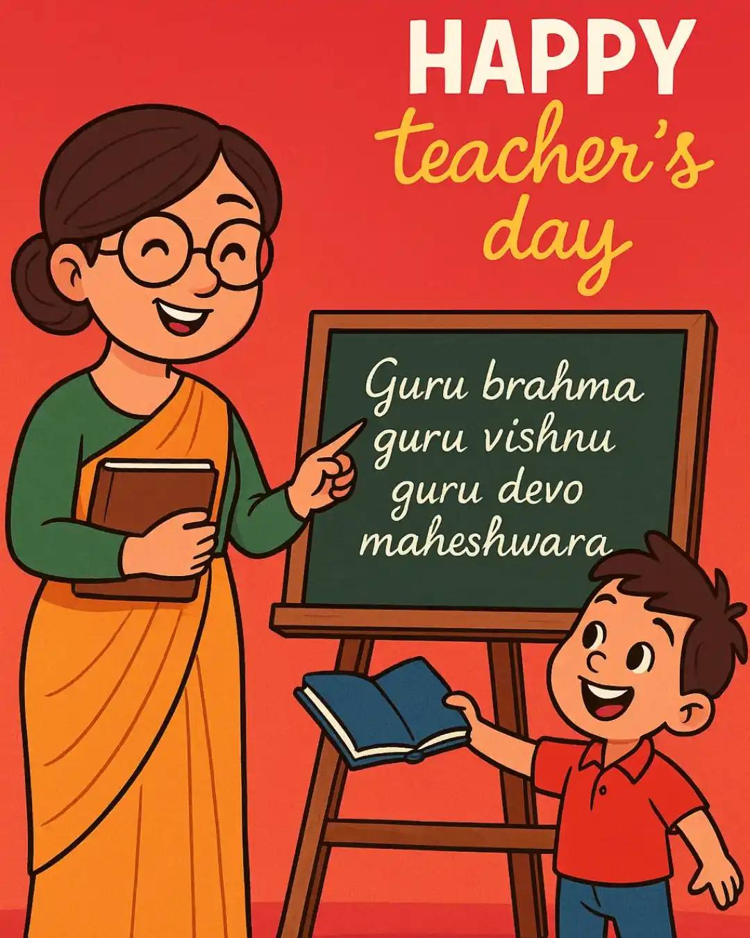 - A cute cartoon-style illustration with a teacher and student holding books. Add on the blackboard: “Guru Brahma, Guru Vishnu, Guru Devo Maheshwara”.