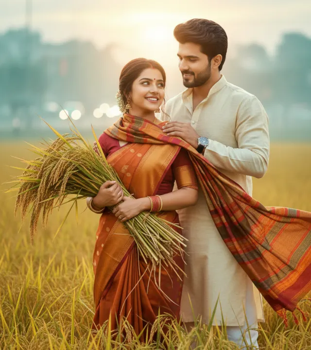A 8K vibrant festive realistic romantic couple image (keep the same facial features from these images), in a golden rice field during sunset. A woman in traditional silk saree clothing with a colorful woven scarf stands holding freshly harvested rice stalks, smiling warmly at the man behind her. The man, also wearing traditional light-colored kurta attire, gently places his hand on her shoulder as they look into each other’s eyes with affection. Soft natural sunlight, warm tones, serene rural atmosphere, lush green and golden rice plants, gentle wind, high-resolution DSLR quality, natural skin tones, peaceful countryside mood. The background features a misty, ethereal road-side of urban area in muted teal, blue, and light-gray tones, enhancing a dreamy summer atmosphere.