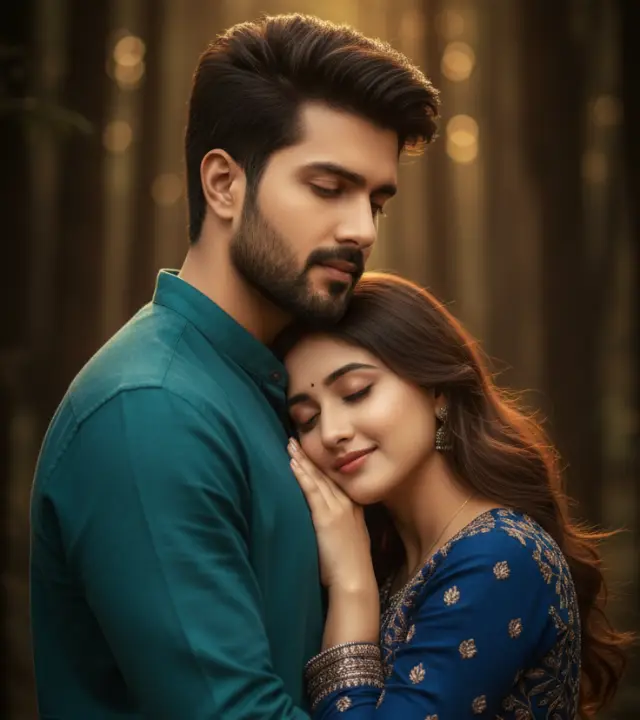 The reference images from these two and create a 8K ultra-hyper realistic romantic portrait of a young couple hugging closely in a forest setting. The man gently embraces the woman with both arms, holding her protectively, while she rests her head on his chest with a peaceful smile and closed eyes. Soft golden light illuminates their faces, creating a dreamy, emotional atmosphere. The background is blurred with deep shadows and warm bokeh, enhancing the intimate mood. The man wears a teal shirt; the woman wears a dark blue outfit. High-detail skin texture, smooth tones, soft focus, DSLR-quality, depth of field, dramatic lighting, dark aesthetic vignette. Foreground is softly blurred with a shallow depth of field (f/1.8 DSLR look), producing a strong cinematic bokeh effect.