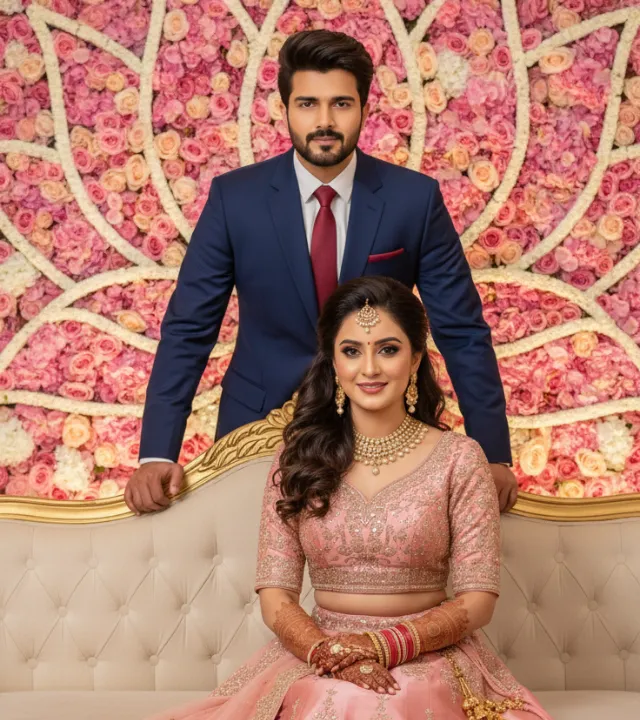 8K ultra-realistic Indian engagement photoshoot. A couple (keep the images from these images) posing on a cream-colored sofa in front of a luxurious floral backdrop filled with dense pink, peach, and white flowers arranged in a lotus-shaped pattern. The woman sits elegantly wearing a heavily embroidered silky shiny pink blended peach lehenga with intricate beadwork, soft curls, traditional jewelry, and mehndi on her hands. The man stands behind the sofa, leaning slightly forward, dressed in a navy blue suit with a red tie and white shirt. Warm golden lighting, soft bokeh, rich wedding décor, vibrant colors, crisp details, full-body composition, premium DSLR look, cinematic tone, perfect skin texture, natural expressions.