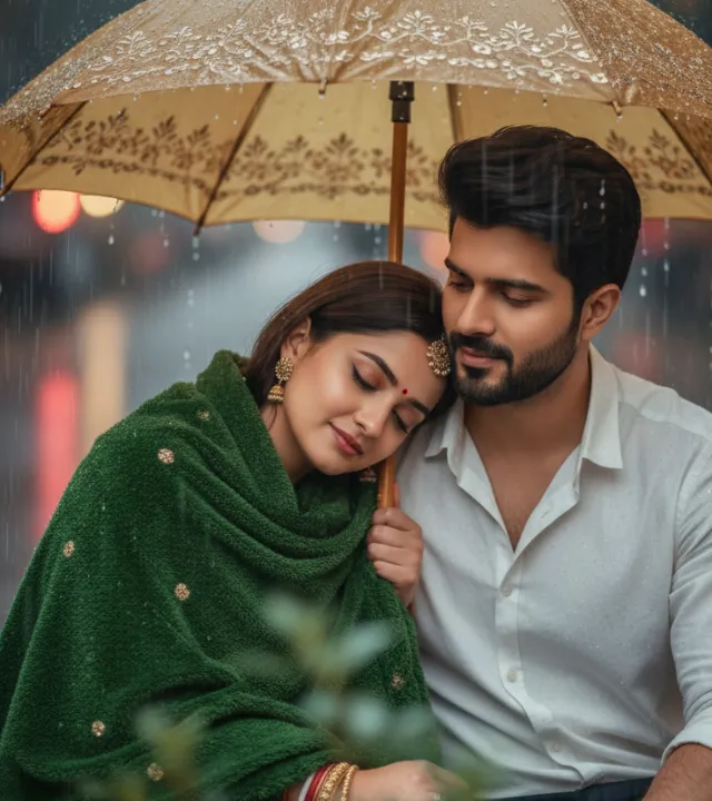 The reference images from these two and create a 8K ultra-realistic close-up Indian wedding portrait, A heartwarming romantic photo of a couple sitting under an umbrella on a rainy day. The woman in a green shawl rests her head on the man’s shoulder, who wears a white shirt. The mood is cozy, emotional, and cinematic. Foreground is softly blurred with a shallow depth of field (f/1.8 DSLR look), producing a strong cinematic bokeh effect.