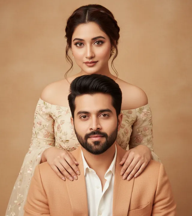 A 8K vibrant festive realistic romantic couple image (keep the same facial features from these images), elegant studio portrait of a stylish couple posed closely together against a warm beige background. The woman stands slightly behind, resting her hands gently on the man’s shoulders, wearing an off-shoulder floral outfit with soft, natural makeup and braided updo hair. The man sits in front wearing a light orange blazer over a white shirt, with a calm and expressive look. Soft, diffused lighting, smooth skin tones, high-fashion editorial style, clean composition, warm color palette, DSLR-quality detail, modern magazine aesthetic. High dynamic range lighting with soft directional light, crisp highlights 30% transparent , and smooth shadows.