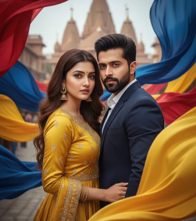 A 8K vibrant festive realistic romantic couple image (keep the same facial features from these images), and create a 8K cinematic couple portrait in a vibrant street setting, framed by flowing colorful shiny fabrics in red, blue, and yellow. The woman wears an elegant traditional silky yellow outfit with gold embroidery, long wavy hair, and ornate earrings, while the man stands beside her in a sharp suit, both looking directly into the camera with intense, expressive eyes. A grand temple with domes and minarets rises softly in the blurred background, giving a majestic cultural atmosphere. Dramatic composition, shallow depth of field, dynamic motion in the fabric, rich colors, high-end editorial photography, smooth skin tones. High dynamic range lighting with soft directional light, crisp highlights 30% transparent , and smooth shadows.