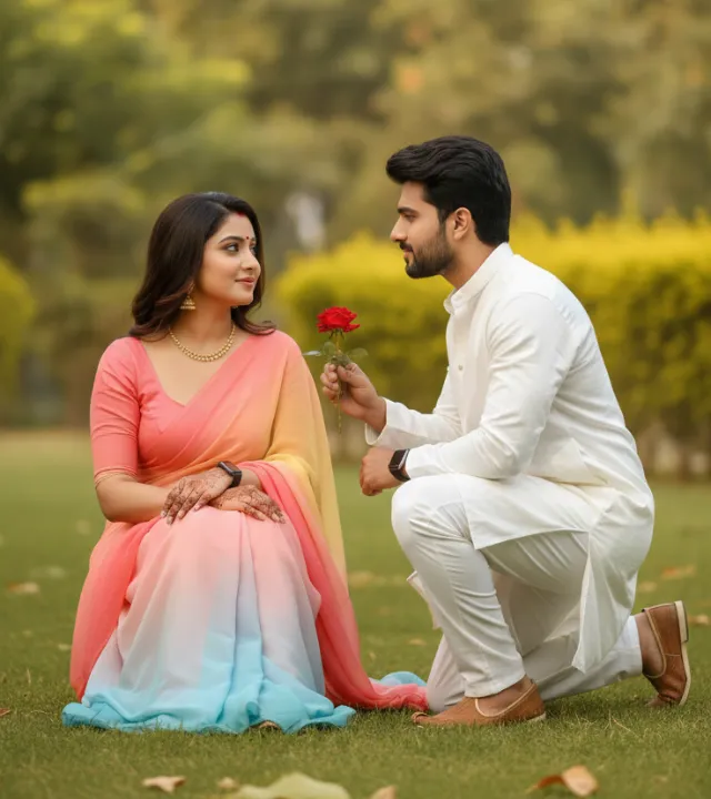8K Hyper-realistic vibrant beautiful Indian women (retain same facial features from this) seating in a beautiful garden on green grass. She is wearing a flowing, gradient chiffon saree that transitions from pastel red to yellow and blue at the hem, a golden chain, smart watch, red bindi, and mehendi. The man (keep the same face 100.999% same from image 2) is neel down ,holding a rose toward the woman . He is wearing white kurta pajama with kolapuri chappal. The foreground create deep DSLR style bokeh. The background is dissolve into smooth green and yellow blur with subtle warm highlights.