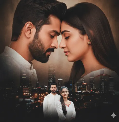 Main Couple (Top): set against a softly blurred backdrop transitioning into a dark, abstract cityscape texture.