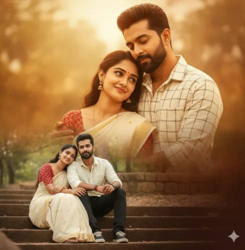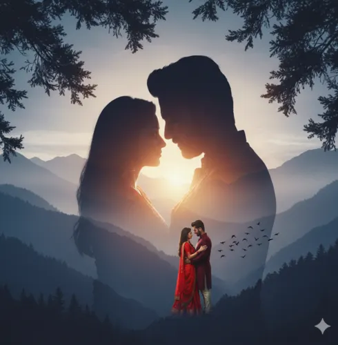 Behind them, a larger ghosted overlay of the same couple—he in a dark grey shirt, she in dark blue ethnic wear—embracing and looking upward toward the light.