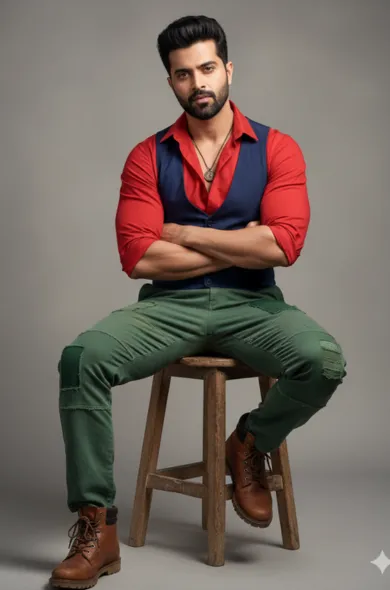 A ruggedly handsome man retain same facial features from this image with dark, slightly wavy hair and a short beard is seated on a simple wooden stool against a neutral gray background. He is wearing a red button-up shirt with the sleeves rolled up, a Deep blue vest over it (possibly part of overalls, as straps are visible), and distressed, patched green pants. His arms are crossed, and he is looking directly at the viewer with a serious, thoughtful expression. He is also wearing sturdy brown lace-up boots and a necklace with a round pendant. The overall aesthetic is natural, slightly country or rustic, highlighting his masculine features and sturdy attire.