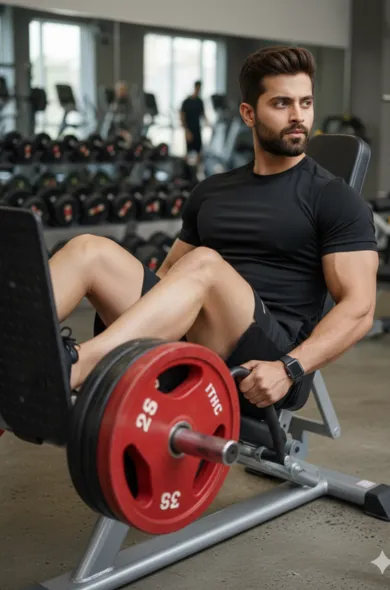 Create a hyper-realistic 8K fit, muscular man (keep the same facial features from this image) with short brown hair, wearing a black t-shirt and black shorts, is sitting on a leg press machine in a gym. He is looking off to the right side of the frame with a focused expression. His legs are bent and positioned to push the weight, which includes a prominent red weight plate in the foreground. He has a smartwatch on his left wrist. The gym floor is concrete.