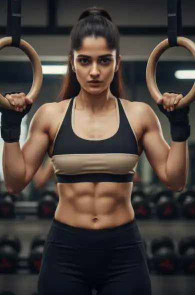 8K hyper-realistic and cinematic DSLR captured a fit muscular physiques woman (same facial features from this image ) with dark hair pulled back in a ponytail is posing with gymnastic rings in a gym setting. She is wearing a black sports bra with a beige band and black leggings, along with black hand wraps. She has a direct, serious gaze towards the camera.