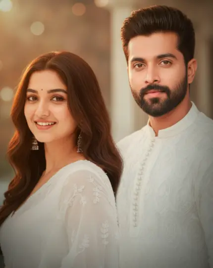 Blend these two images into one seamless cinematic composition in 8K ultra-realistic quality. Combine both subjects naturally, matching lighting, shadows, and perspective. Use soft, golden-hour light with warm highlights and rich contrast for a film-like tone. Maintain accurate skin tones, sharp details, and realistic depth of field. Ensure the background merges smoothly with no visible edges or distortion. Apply cinematic color grading — warm amber and orange in highlights, deep teal and brown in shadows, and slightly desaturated midtones. Add gentle atmospheric haze, soft bokeh, and subtle vignette for emotional depth. The final image should look like a professional movie still — immersive, natural, and storytelling — as if both photos were taken together in one flawless cinematic frame.