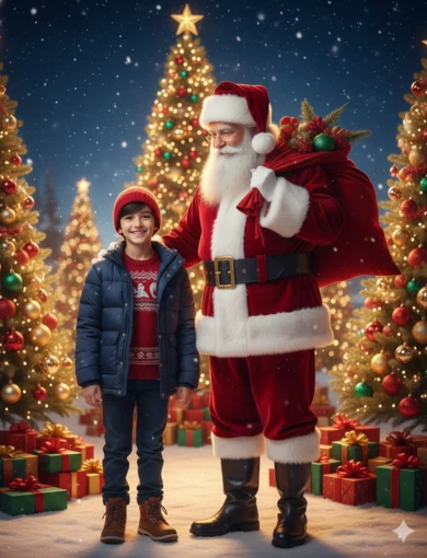 A hyper-realistic, ultra-detailed 8K cinematic Christmas portrait set in a magical winter wonderland at night. Soft snowfall drifts gently through the air against a deep blue, star-filled background, illuminated by warm festive lights. At the center of the scene stands a joyful 7-year-old boy, captured full-body, smiling brightly with innocent excitement. He is standing beside Santa Claus, who is dressed in a classic red velvet suit with white fur trim, a black leather belt, and polished boots, featuring highly detailed fabric textures and natural folds. The boy (keep the same facial features from this image) wears a cozy winter outfit suitable for Christmas—such as a warm jacket or sweater, trousers, and boots—styled neatly and age-appropriate, with realistic cloth detail. Santa stands slightly turned toward the child, creating a warm, protective, and friendly presence, while the boy looks happy and comfortable beside him, conveying trust and festive joy. In the background, beautifully decorated Christmas trees glow with colorful ornaments, fairy lights, and soft bokeh highlights. Wrapped gift boxes in red, green, and gold sit at the base of the trees, adding depth and holiday richness. A gentle golden rim light outlines both figures, enhancing realism and separation from the background. The overall composition radiates warmth, happiness, and Christmas magic, with exceptional detail in lighting, skin tones, clothing textures, and atmospheric effects.