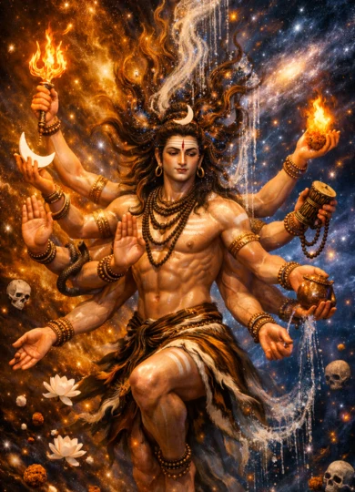 Shot on Phase One XT with 110mm f/2.8 lens, shallow depth of field isolates Shiva against the infinite cosmos. Skin rendered with divine subsurface scattering, glowing vibhuti, molten gold jewelry, and celestial reflections on each rudraksha bead. Color palette: molten golds and cosmic magentas against deep nebula blues, with glowing sacred ash. Hyperrealistic divine anatomy, every muscle fiber, flowing lock, and cosmic detail captured in 8K resolution. Portrait optimized for iPhone wallpaper, ethereal, luminous, and spiritually majestic—powerfully grounded in cosmic realism.
