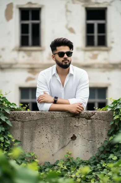 A hyper-realistic, 8k medium shot photograph, captured with a 50mm prime lens at a slightly low angle, features a stylish individual. The subject is a man, uploaded face as reference, wearing a crisp white linen shirt with the top buttons undone, and dark, classic sunglasses. He has a well-groomed beard and neatly styled dark hair. His forearms are crossed and resting on a textured, weathered concrete ledge, which spans the mid-ground. Lush, vibrant green foliage, possibly ivy or a similar climbing plant, frames the bottom and sides of the image, creating a natural, soft bokeh in the foreground. In the background, an old, dilapidated building with peeling white paint and multiple dark-paned windows provides an urban, gritty contrast. The lighting is natural and soft, suggestive of an overcast day, creating subtle shadows and even illumination, highlighting the highly detailed textures of the concrete, foliage, and the man’s shirt. The composition utilizes the rule of thirds, placing the subject slightly to the right, creating a balanced yet dynamic scene with cinematic lighting and professional photography aesthetics.