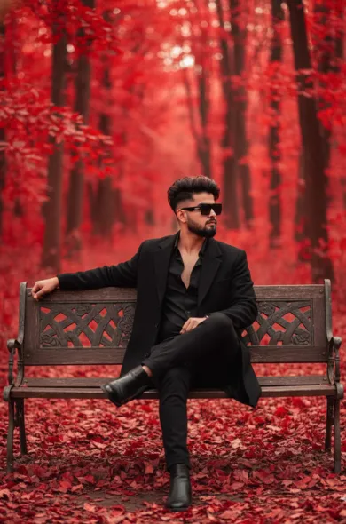 A hyper-realistic 8k vertical composition capturing a person seated on a rustic wooden park bench within a vibrant autumn forest. The person, with an uploaded face as reference, is elegantly dressed in a sophisticated all-black outfit: a long, tailored black overcoat, a black button-up shirt with an open collar, black slim-fit trousers, and polished black leather Chelsea boots. They are accessorized with stylish black sunglasses and a silver-toned wristwatch on their left wrist. The subject is posed casually with their right leg crossed over their left, their gaze directed thoughtfully towards the right side of the frame, creating a sense of contemplation. The camera employs a slightly low-angle perspective, framing the subject slightly off-center to the left, allowing for a balanced composition with negative space above. The background is a breathtaking expanse of a dense forest, where all the trees are adorned with intensely vibrant, deep red and maroon autumn leaves, mirroring the thick carpet of fallen leaves covering the entire ground. This creates a striking, almost monochromatic red environment that contrasts sharply with the subject’s attire. The scene is illuminated by soft, diffused natural light, producing cinematic lighting with subtle rim lighting on the subject’s hair and shoulders, and a warm, ambient glow reflecting from the rich red foliage. A medium telephoto lens is used to achieve a shallow depth of field, rendering the background leaves into a beautiful, ethereal bokeh of soft, glowing red orbs. The wooden bench exhibits highly detailed texture and intricate carved patterns on its backrest, while the ground’s blanket of crisp red leaves adds another layer of highly detailed texture to the hyper-realistic scene.